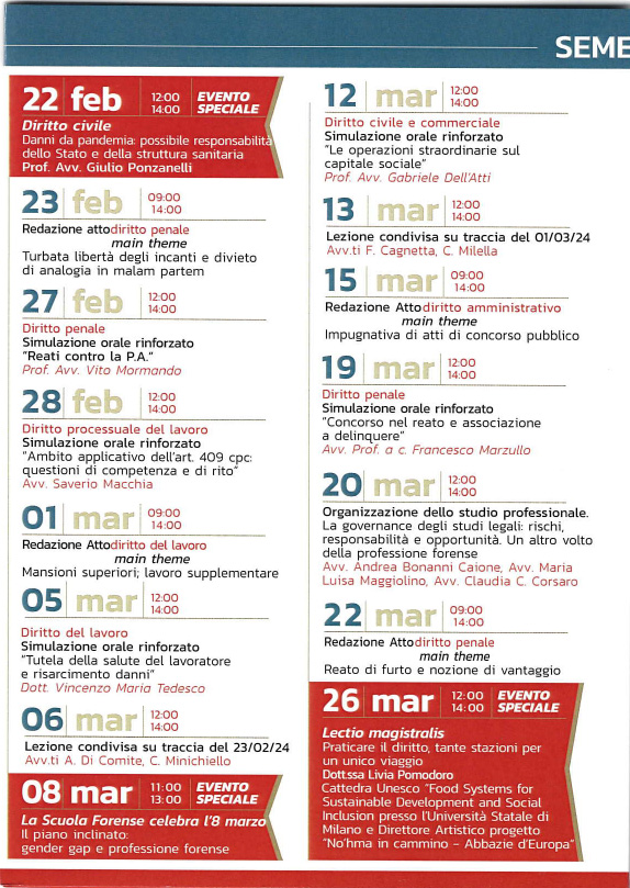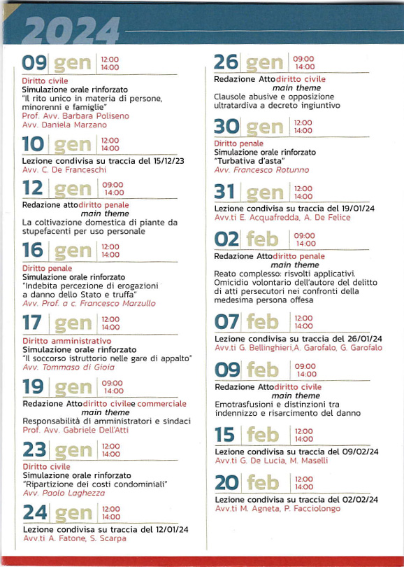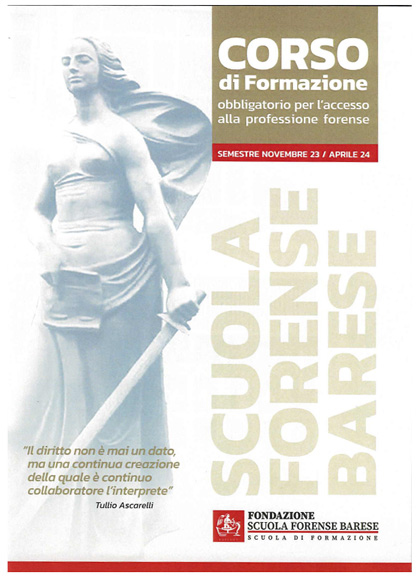 La Scuola Forense Barese, nell'ambito del Corso di Formazione obbligatorio per l'accesso alla professione forense, ha invitato l'avv. Marzullo Francesco (componente del Comitato scientifico) a tenere due lezioni in data 16 gennaio 2024 e 19 marzo 2024.